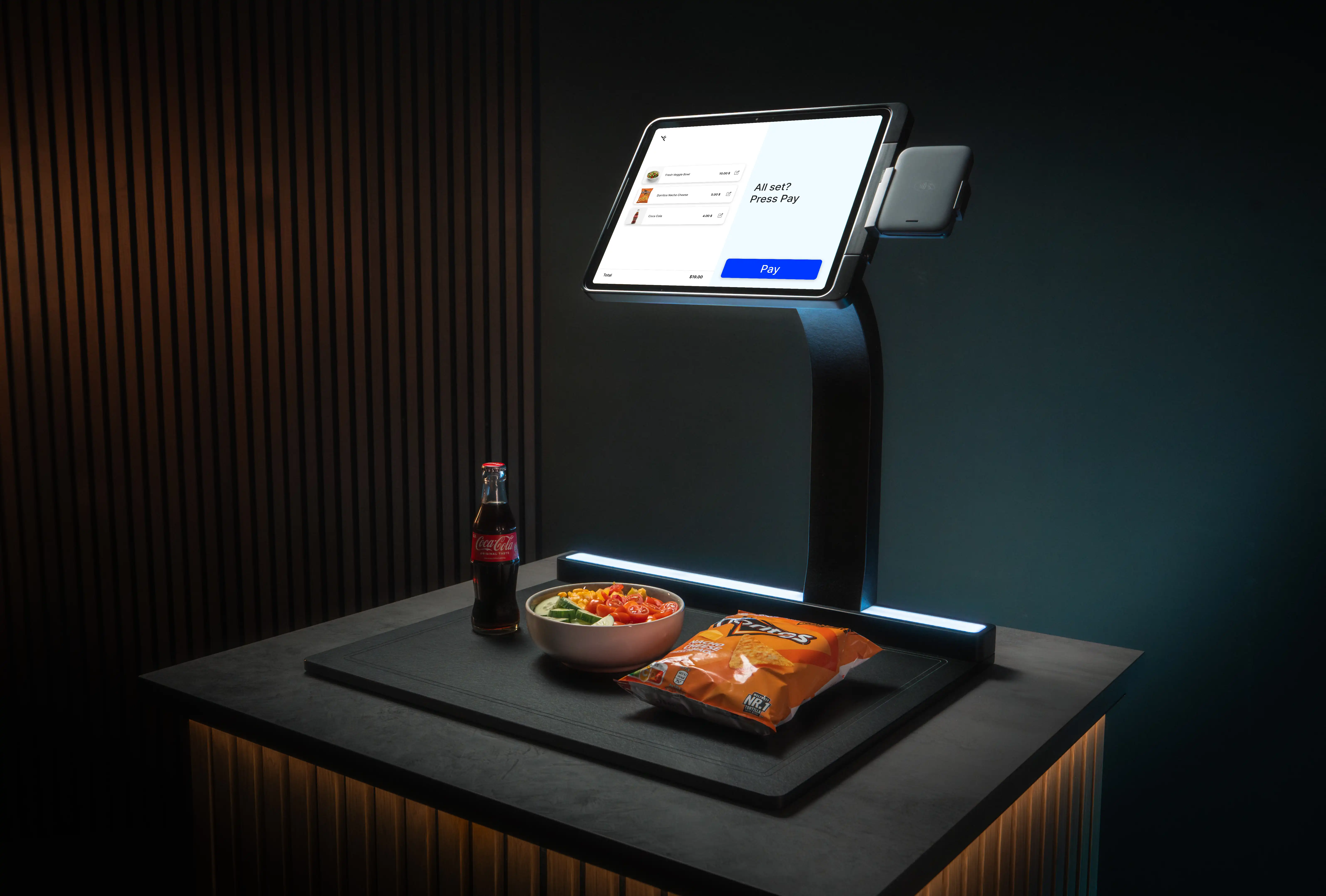 The AI software on the iPad recognises each item in under a second — by appearance alone. No barcode, no RFID, no manual input.